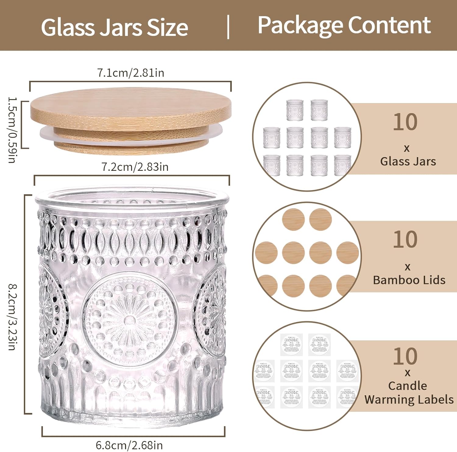 Create beautiful DIY candles with this 10-pack of 7.5oz clear glass jars, each featuring a natural bamboo airtight lid and safety label. Made from thick, heat-resistant glass, they’re perfect for candle making, gifting, or decorative storage. Ideal for use at home or for small candle businesses, these reusable jars also make stylish containers for spices, crafts, or cosmetics.